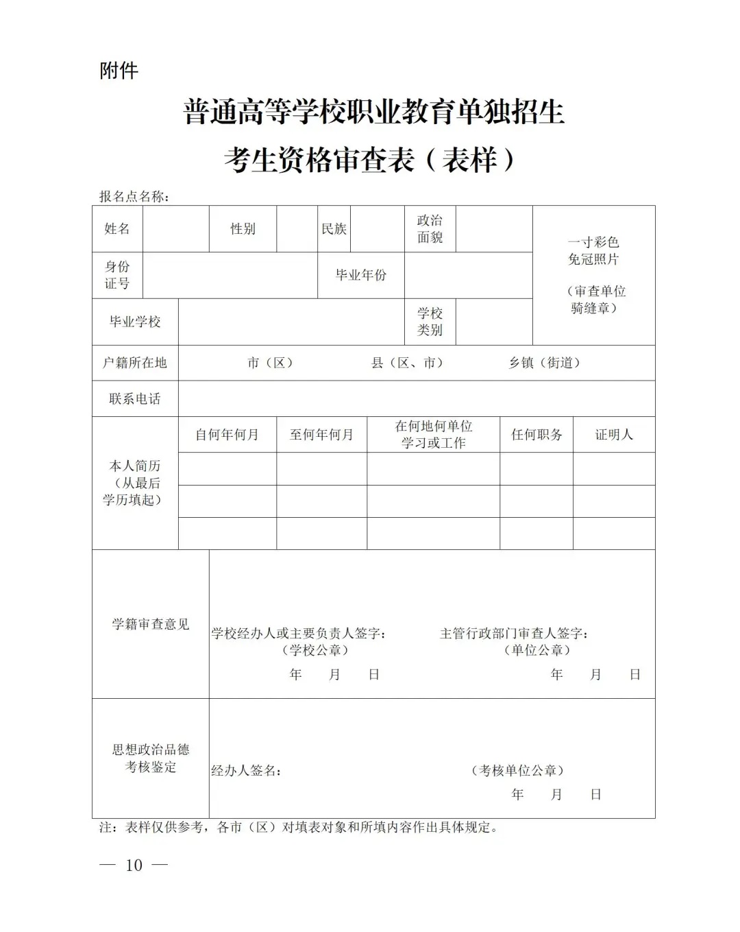 (二)我省应、往届“三校生”在学籍注册(毕业)学校所在市(区)指定的报名点报名,往届“三校生”也可在户籍所在市(区)指定的报名点报名。报考者应于报名前到报名点领取《普通高等学校职业教育单独招生考生资格审查表》(表样见附件),准确填写个人信息,并接受县级、市级招生考试机构组织的报考资格审查。