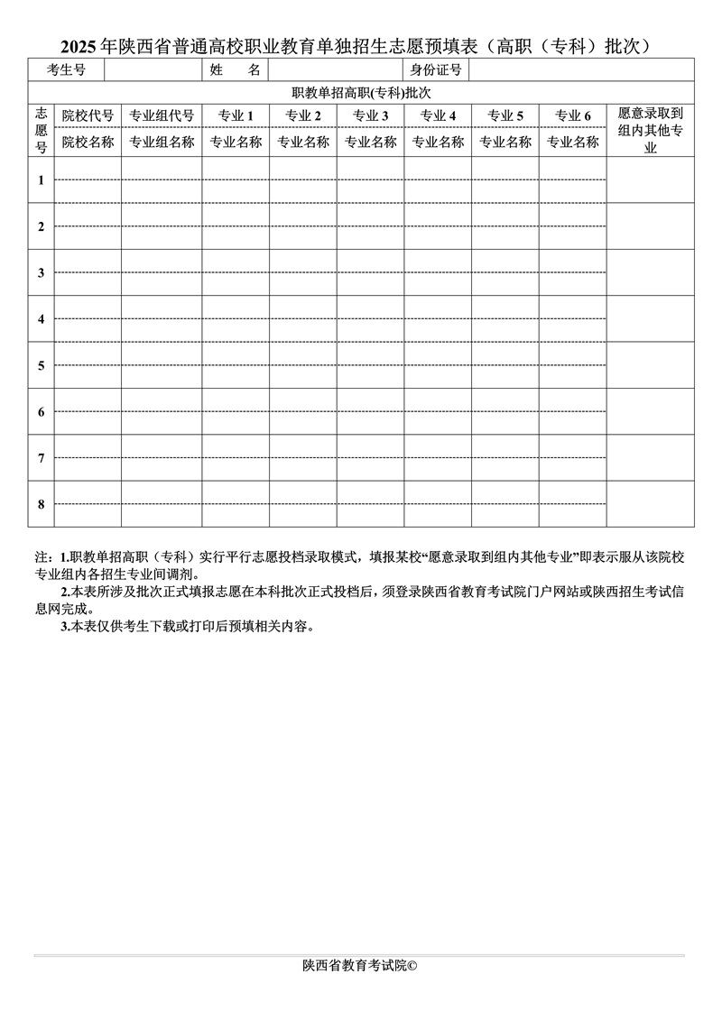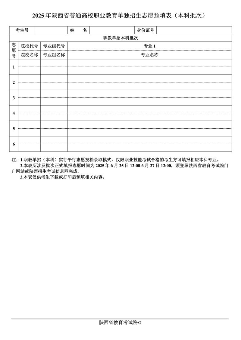 可点击下载附件《2025年陕西省普通高校招生志愿预填表》。或登录陕西省教育考试院官网下载。